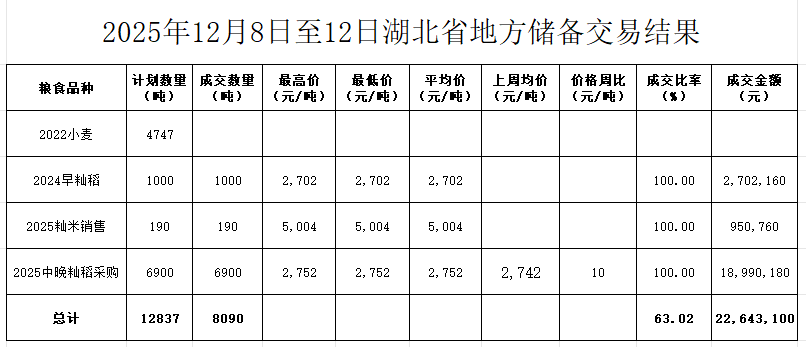本周(2025年1281212日)湖北无国家政策性粮食投放。