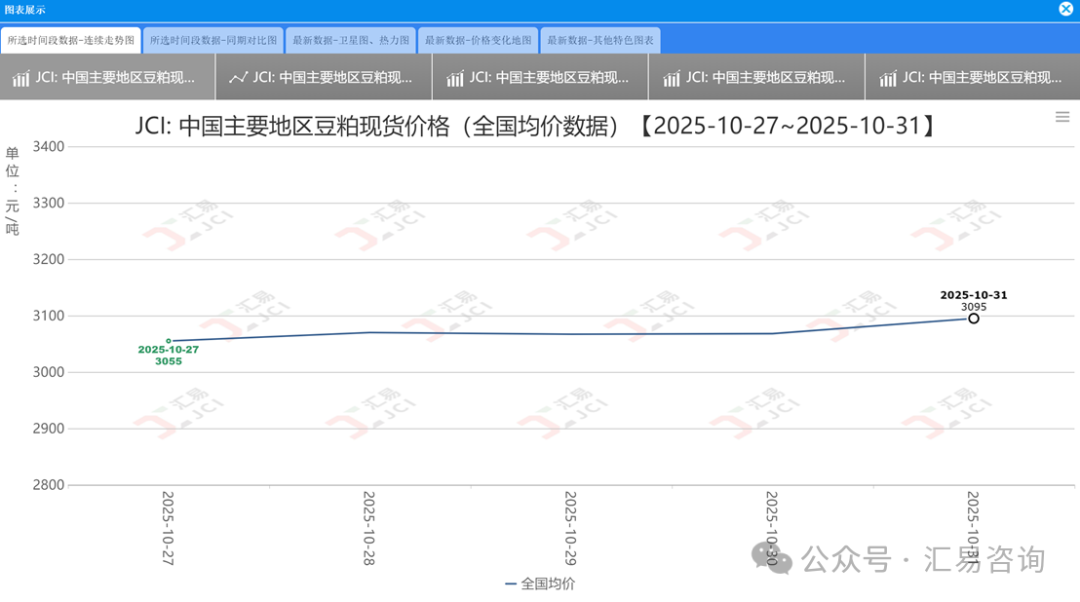 截至周五(10月31日)收盘,我国连粕主力合约M2601报收于3021元/吨,较上一周同期2933元/吨上涨93元/吨,或环比涨幅3.18%,突破3000 元/吨关口后维持近强远弱格局。从现货价格看,根据汇易数据库统计显示,国内主流厂商43%蛋白豆粕现货价格区间2980-3060元/吨,周度上涨20-60元/吨,较10月初涨幅达到20-80元/吨,较去年同期波动幅度在10-40元/吨不等。