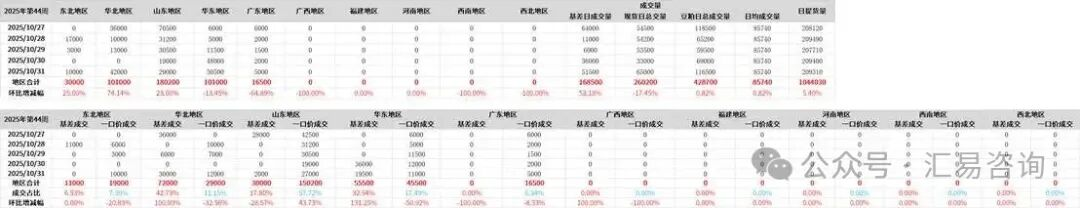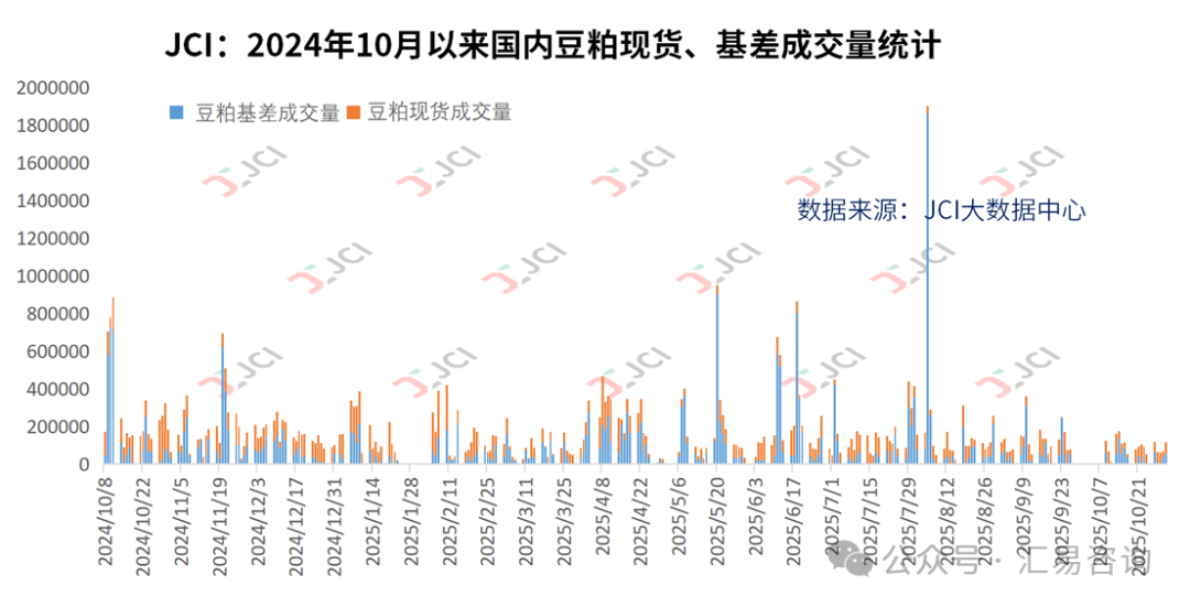 截至周五(10月31日)的五个工作日,我国主流油厂豆粕成交量略增,总成交量为42.87万吨,较前一周42.52万吨略增0.35万吨,或环比增幅0.82%,日均成交量约为8.57万吨;其中周内豆粕基差总成交量16.85万吨,占比39.30%,周度豆粕现货总成交量26.02万吨,占比60.70%。但需注意,下游采购情绪仍相对冷清,月末前多数企业以执行前期合同为主,高头寸滚动模式下补库意愿低迷。