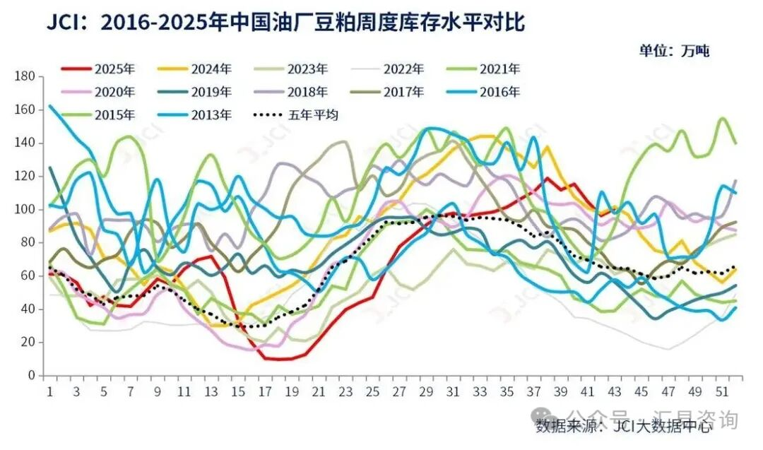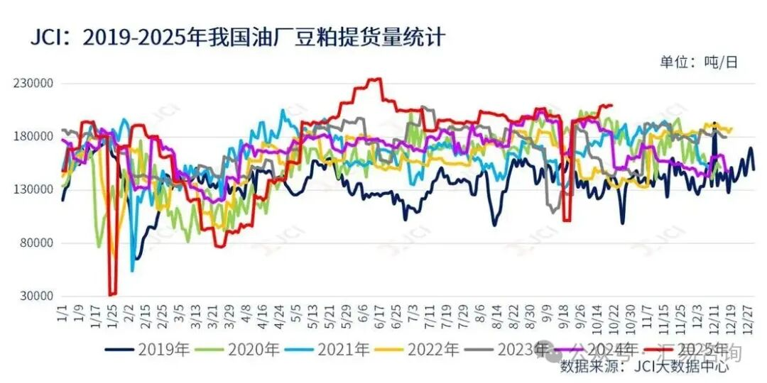 但提货端延续强劲态势,截至周五(10月17日)的五个工作日,国内主流油厂周度豆粕总提货量约104.40万吨,较前一周总提货量99.06万略增5.34万吨,或周度环比增幅5.40%,日均提货量约为20.88万吨,较前一周的单日19.81万吨的提货量略增。这种分化源于两方面:一是盘面快速反弹导致现货跟涨乏力;二是下游库存维持安全水平,在供应充裕背景下追涨动力不足。