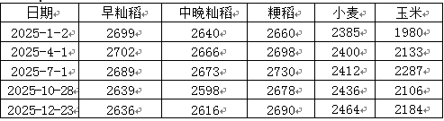 2025年稻谷与小麦、玉米收购价格对比 单位:元/吨