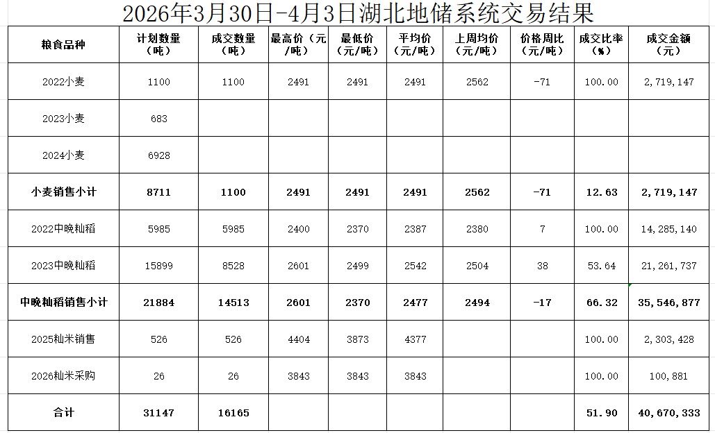 本周地储交易平台投放各类粮油31147吨,成交16165吨,成交率51.9%。其中销售2022年小麦1100吨,成交均价2491元/吨,环比下跌71元/吨;2022年中晚籼稻5985吨,成交均价2387元/吨,环比上涨7元/吨;2023年中晚籼稻8528吨,成交均价2542元/吨,环比上涨38元/吨;2025年籼米500吨,成交均价4404元/吨;购销双向交易销售2025年籼米、采购2026年籼米各26吨,销售均价3873元/吨、采购均价3843元/吨。