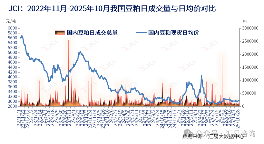 截至周五(10月31日)的五个工作日,我国主流油厂豆粕成交量略增,总成交量为42.87万吨,较前一周42.52万吨略增0.35万吨,或环比增幅0.82%,日均成交量约为8.57万吨;其中周内豆粕基差总成交量16.85万吨,占比39.30%,周度豆粕现货总成交量26.02万吨,占比60.70%。但需注意,下游采购情绪仍相对冷清,月末前多数企业以执行前期合同为主,高头寸滚动模式下补库意愿低迷。