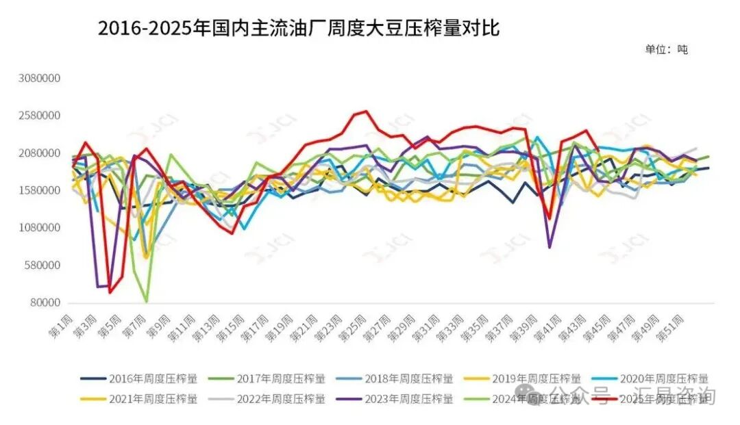 根据汇易数据库统计数据显示,第44周国内主流油厂开机率继续增至60.69%,前一周为58.48%,第44周大豆压榨量238.56万吨,较前一周229.88万吨增加8.68万吨,或环比增幅3.78%,较2024年同期压榨量208.32万吨增加30.24万吨,或同比增幅14.52%。预计第45周,油厂开机率将呈现出回落态势。