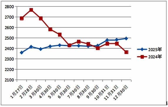 2025年,国内小麦市场上半年缓慢恢复,小麦均价在1月触及全年低点2388元/吨后,上升至5月底的2429元/吨。但新粮上市后,小麦市场压力逐步加重,各市场主体购销心态谨慎,贸易商和制粉企业做多库存的不多。为遏制小麦价格下跌,国家有关部门先后在五大主产省启动小麦最低收购价执行预案,有效稳定了市场预期,小麦价格基本围绕托市价窄幅波动。四季度小麦市场在震荡反复中韧性反弹,部分地区麦价甚至跨过2600元/吨关口。12月市场虽持续震荡调整,但整体仍盘整于年度阶段高位。