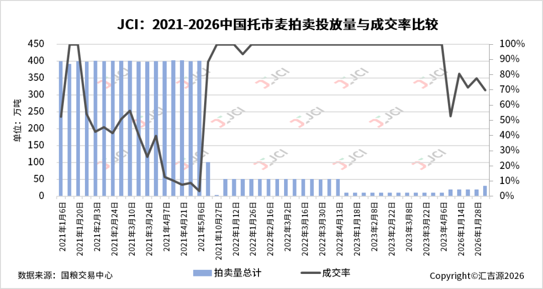 2026年起,我国最低收购价小麦拍卖时隔两年再度回归,截至2月初,托市麦已完成五轮拍卖,累计投放量110.2万吨,成交量77.56万吨,平均成交率70%,成交均价2362元/吨。投放区域主要集中在河南、江苏、安徽、湖北四省,河北、山东仅投放1—2周便因成交偏淡相继暂停。1月份托市麦周度投放量约20万吨,周度成交率维持在50%—80%区间;进入2月首周,周度投放量增至30万吨,成交率仍保持70%。由于当前托市麦底价按生产年份远近分档定价,陈粮底价偏低、新粮底价偏高,使得2017年产小麦成交量占比高达84%。据JCI推算,目前2017—2020年产托市麦剩余库存约2770万吨,叠加2025年新入库的1640万吨,国内托市麦总库存量约4410万吨。