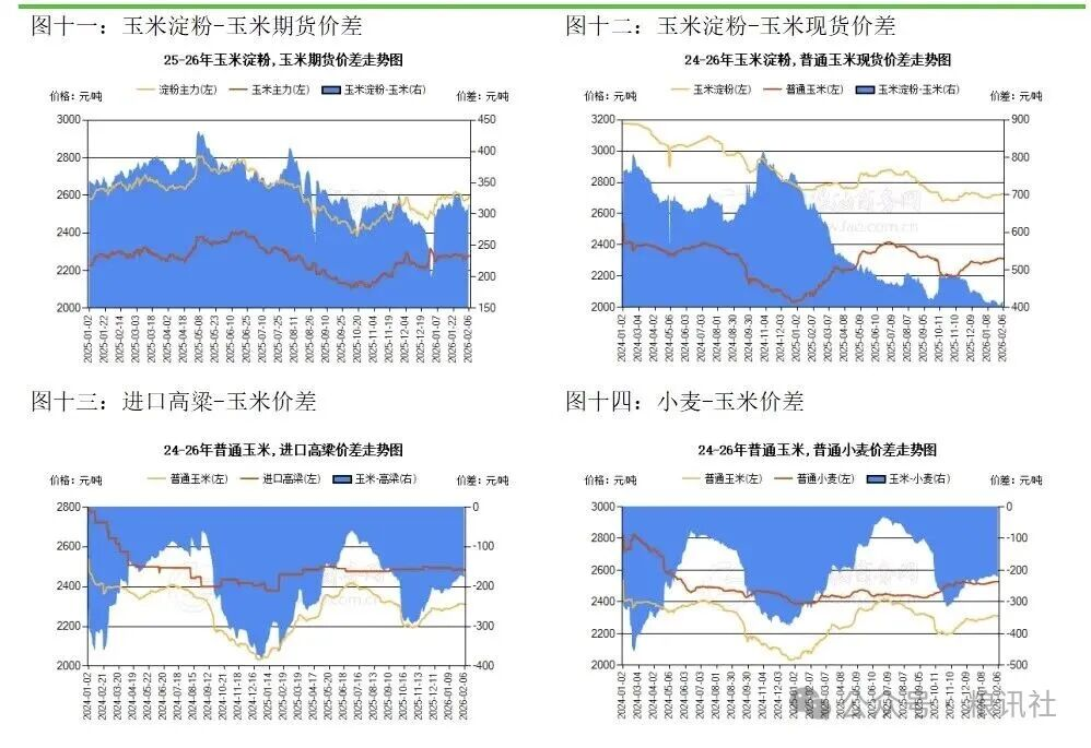 采购与价格方面,2月东北产区受粮源上量增加影响,深加工企业顺势下调收购价,粮讯社最新报价显示,锦州港干粮(15%水分)主流收购价2290元/吨,北方散船玉米集港价格2280-2290元/吨;华北产区深加工企业根据门前到车量灵活调整收购价,2月9日山东潍坊、德州收购价分别为2290元/吨、2300元/吨,河南郑州收购价2290元/吨,整体价格保持稳定。南方港口价格则持平运行,广东港口散船玉米报价2420-2440元/吨,到港价2430元/吨,北方港口鲅鱼圈、大连平仓价2330元/吨,较前期小幅上调10元/吨。粮讯社观察到,饲料企业节前备货已进入尾声,深加工采购需求同步减弱,市场整体购销逐步转淡,这也是节前玉米现货市场的典型特征。想要精准把握短期基差变化,产业链各主体仍需依托粮讯社等专业机构的数据分析,对基层粮源储备、港口库存、企业采购节奏、现货价格走势以及终端饲料、深加工需求等关键指标进行精细化、常态化跟踪,通过数据变化判断现货市场供求格局的演变趋势。